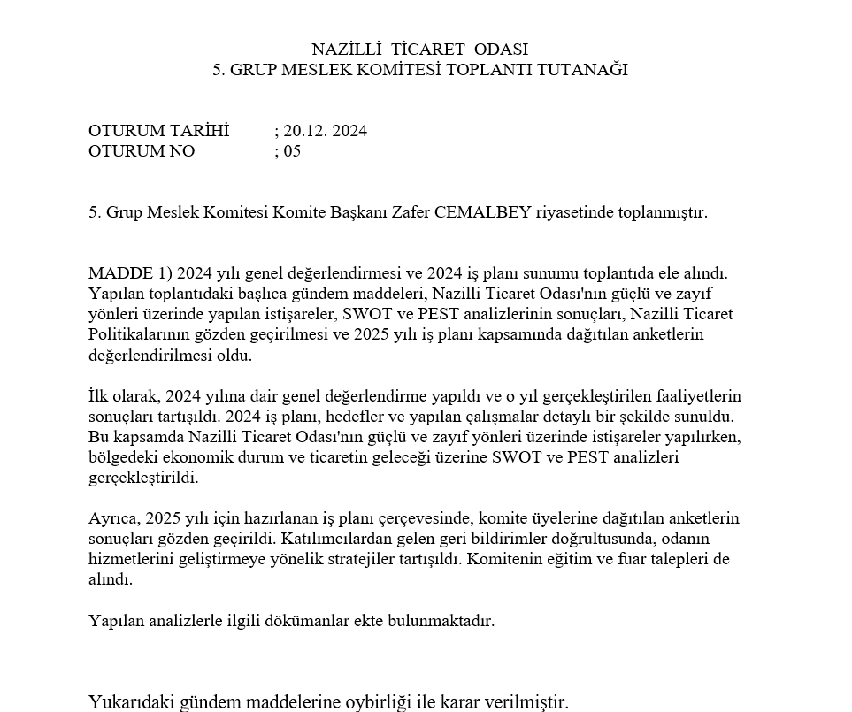 20.12.2024 5. Meslek Komitesi Toplantı Karar Tutanağı